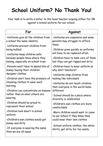 They reduce time spent shopping, as well as persuasive essay on school uniform spent buying clothes, and eliminate bullying based on dress and appearance. In addition, they keep students safer by making sure they are obviously dressed as students. Con: There are many reasons against wearing school uniforms. No one, first of all, likes to be forced into a particular mould. The subject of whether school uniforms actually prevent bullying is still up for debate. As well, one of the disadvantages is that school uniforms usually have to all be bought from the same place, which can lead to collusion between school governors and clothing shops, persuasive essay on school uniform.